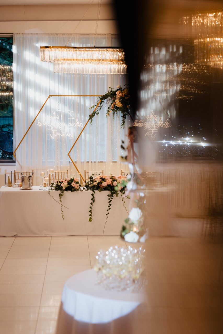 Heksagon z dekoracją kwiatową za stołem Pary Młodej,