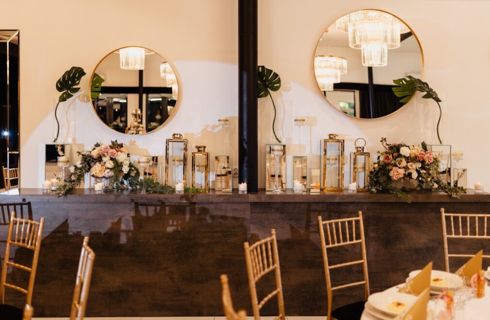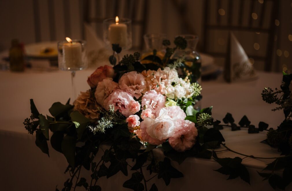 Dekoracje kwiatowe stołu Pary Młodej w Pakiecie Złotym i Kryształowym,